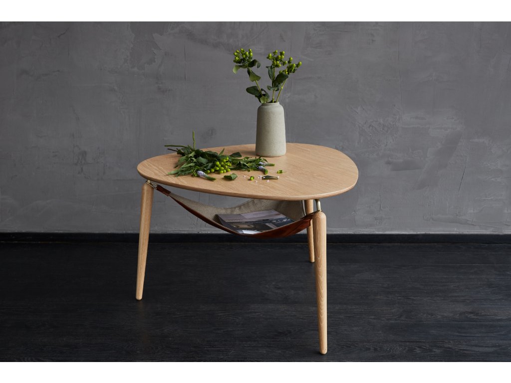 A minimális dizájnt szépen kiegészíti a fa és a fém kiegészítők ízléses kombinációja. Az asztalnak könnyedséget és éteri lebegést kölcsönöznek a vékony, elegáns lábak. Az asztal alatt egy praktikus háló feszül, amelyre mindenféle apróságot helyezhet úgy, hogy azok mindig kéznél legyenek. A háló egyik oldala textilből a másik pedig műbőrből készült, amelyet könnyedén átfordíthat, így adva új megjelenést a belső térnek.