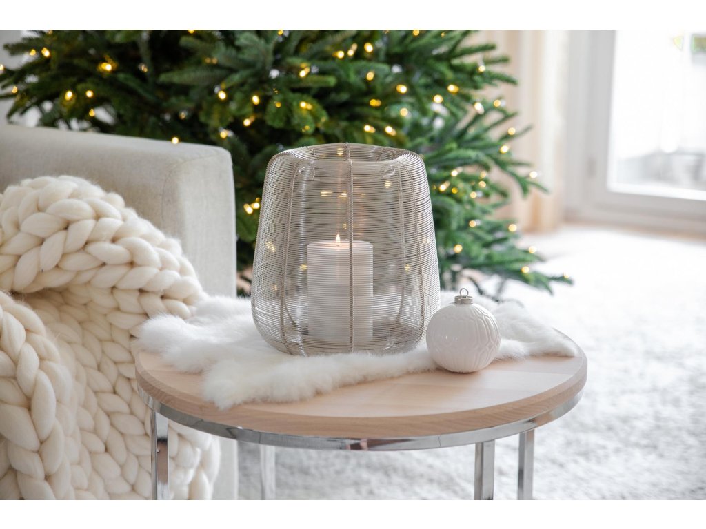 A Kurt lámpás lenyűgözi az elegáns ezüst megjelenés és a különleges barázdált díszítés kombinációjával, amely modern dizájnt hoz létre, és nagyon lágy és kellemes fényt áraszt. Az évszaktól függően a gyertyatartót fenyőtobozokkal, virágokkal vagy más választott dekorációval díszítheti.