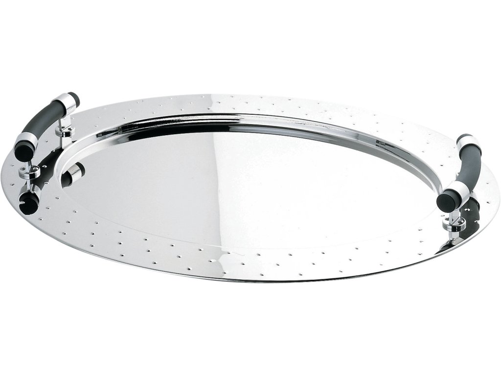 Michael Graves, aki az olasz Alessi márka legsikeresebb terveit készítette, szintén ezt a dizájnos ovális tálcát tervezte. A tálca oldalai fekete, hőre lágyuló gyantából készült stílusos markolatokkal vannak ellátva, ami a lehető legegyszerűbbé teszi a tálca kezelését, és biztosítja, hogy semmi se essen le róla, még akkor sem, ha a házon át a kertbe viszed. A tálca széleit apró pöttyök formájú gravírozás finoman díszíti. Maga a tálca tükörfényesre polírozott rozsdamentes acélból készült, amely nagyon hatékonyan veri vissza a környezet fényét és színeit. Helyezzen egy limonádét gyümölccsel a tálcára, és nézze meg, milyen színt játszik a tálca. A fogantyúknál a tálca 6,3 cm magas, 58 cm hosszú és 45,5 cm széles. Tehát pontosan ilyen tálcára lesz szüksége, amikor legközelebb nagy kerti partit vagy partit rendez.