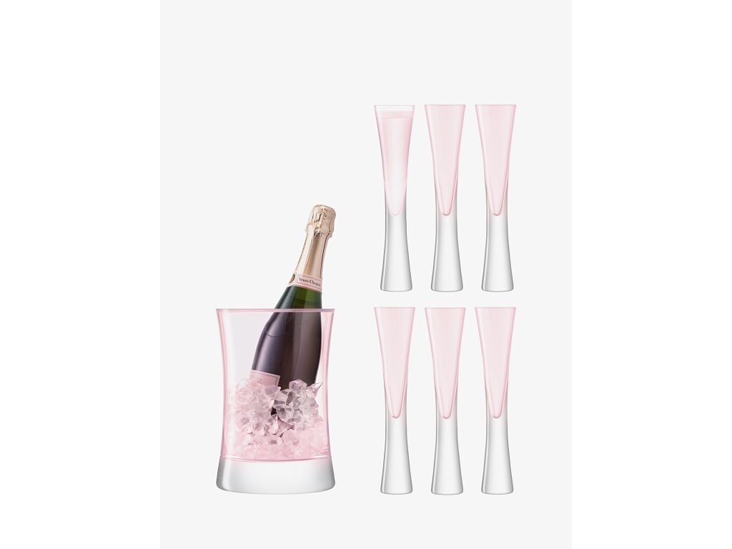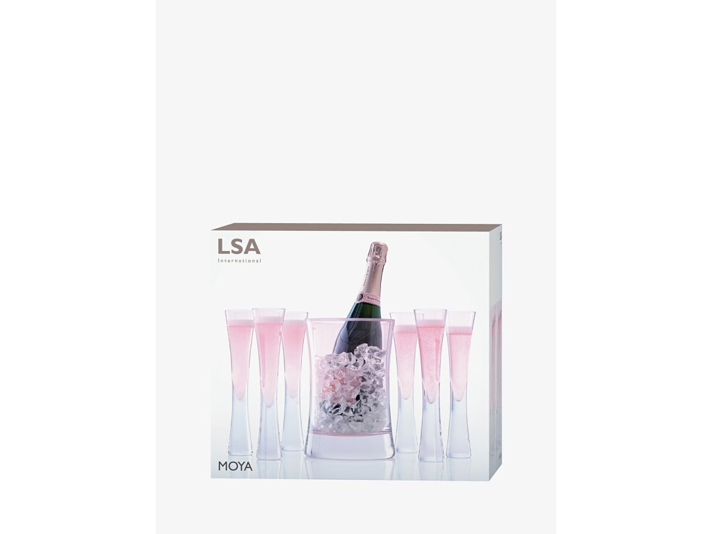 A pezsgőt csak olyan különleges alkalmakhoz kötik, mint például esküvők és születésnapi bulik. A pezsgőt azonnal felnyitás és egy magas pohár oldalára öntve érdemes fogyasztani. A hosszúkás fuvola alakú szemüvegek ideálisak ahhoz, hogy szemünkkel élvezhessük a buborékok gyönyörű szikrázását. A klasszikus keskeny poharakhoz képest ezek a Moya kollekcióból származó LSA poharak enyhén kiszélesített nyakúak, és ennek köszönhetően élvezhető a pezsgő aromája is, ami szépen fejlődik. A rozé által ihletett, szokatlan rózsaszín színezés eredetiséget és stílust kölcsönöz a pezsgőspoharaknak. A poharak kézzel készített fúvott üvegből. A hat pohárból álló készletet egy jég- és palackhűtésre szolgáló vödör egészíti ki, mely a poharakhoz hasonlóan rózsaszín színében is érdekes.