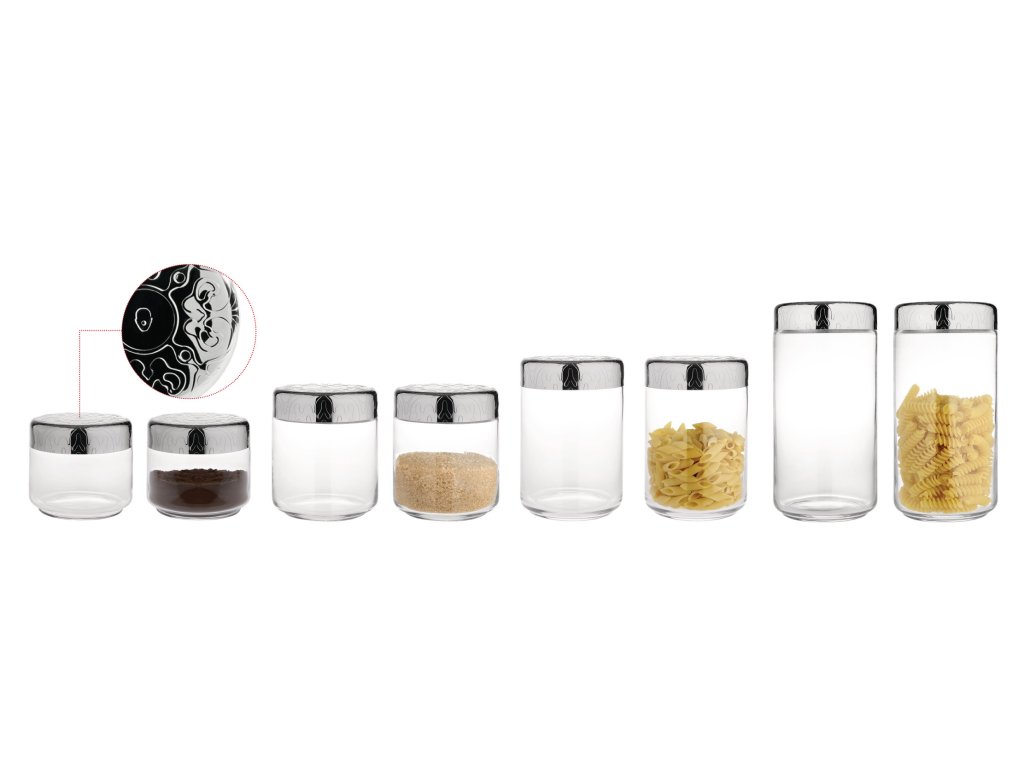 Marcel Wanders világhírű tervező a megalkotója az egyedi Dressed kollekciónak, melyet az olasz Alessi márka számára alkotott. A teljes kínálat stílusos termékekből áll, amelyek gazdagon, ízlésesen, elegánsan díszítettek. A tartály fedelét díszítő gravírozás kifinomult és rendkívül lenyűgöző. Az edény üvegből készült, átlátszó falának köszönhetően könnyen felismerhető, hogy milyen alapanyagot tartalmaz. A doboz hermetikus fedele rozsdamentes acélból készült, melyen dekoratív dombormű gravírozás található. Három méret közül választhat, valamennyi 10,5 cm átmérőjű. Közülük a legkisebb 9,3 cm magas, űrtartalma 0,5 liter, a közepes magassága 12,3 cm, térfogata 0,75 liter, a nagy mérete 15,8 cm és űrtartalma 1 liter. Legelőnyösebb ha több méretű edényt választ, így minden alkalomhoz és alapanyaghoz egységes stílust alakíthat ki a konyhában. A tárolóedények remekül kiegészítik a Dressed kollekció más darabjait, például a tálcákat vagy egyéb más tárolókat.