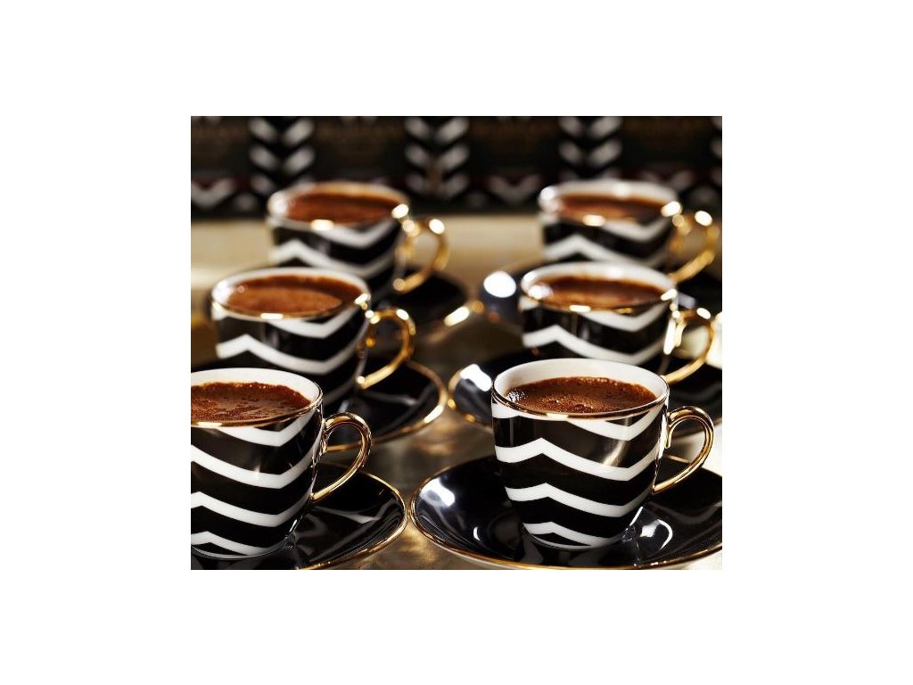 Ez a luxus ajándékszett négy aranyozott fekete-fehér csíkos csészét tartalmaz, fekete színű, aranyozott csészealjjal. A szimmetrikus törések az éjszakai Égei-tenger hullámait idézik. Élvezze ki a kávéját Ön is, egész családjával vagy a barátaival!