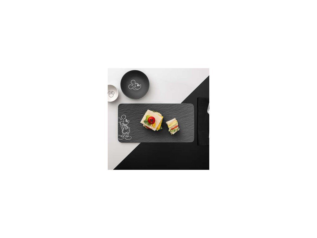 A matt porcelán jellegzetes, természetes pala ihlette struktúrájával feltűnő kontrasztot alkot a finom, minimalista Mickey motívummal. A fekete vagy fehér változat kiemeli a teljes kollekció grafikai tisztaságát, és modern, enyhén városias jelleget kölcsönöz neki.