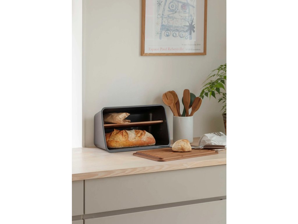 A kenyértartó kiváló minőségű anyagokból készült, amelyek hosszú élettartamot és könnyű tisztítást biztosítanak. A világos tölgyfából készült praktikus fedél egyben vágódeszkaként is szolgál – helyet takarít meg és skandináv egyszerűséget, valamint funkcionalitást kölcsönöz az étkezésekhez.