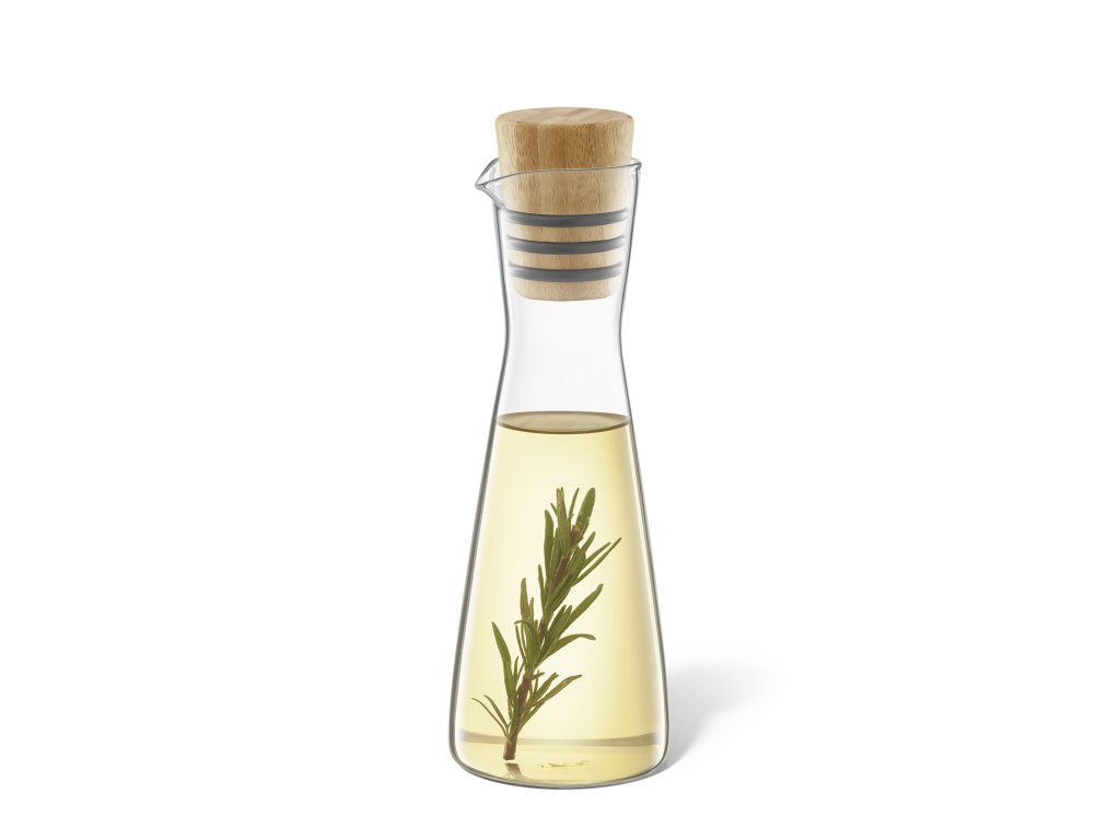 Az ecetes / olajos karaffa finom görbéi, melyeket a bambusz dugó tesz teljessé, gondoskodik a pontról az i-n.