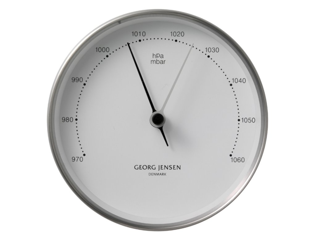 A modern barométer, rozsdamentes acél vázzal és fehér vagy fekete számlappal, bármilyen időjárási körülmények között praktikus kiegészítője a belső térnek. Henning Koppel tervező barométere kiváló példája a skandináv dizájnnak, amely nemcsak a nappalit, a hálószobát, hanem a tantermet is dizájnossá teszi. Márka GEORG JENSEN