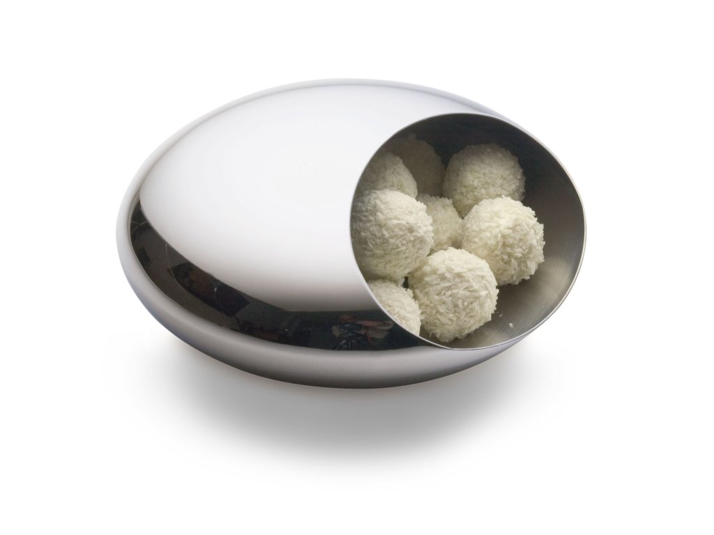 Édességek tárolására alkotva. Csiszolt rozsdamentes acél, a luxus benyomását keltve. A tál két szenvedély kombinációja. Szenvedély az egyedi és hangsúlyos dizájner termékek iránt, és szenvedély az édességek iránt.