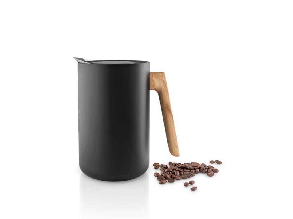 A matt fekete test és a tölgyfa fogantyú elegáns kombinációja igazi dizájndarabpá teszi, amely bármilyen asztal dísze lesz. A vákuumbetétes dupla fal órákig melegen tartja a kávét vagy a teát. A praktikus, kiöntőmechanizmussal ellátott fedélnek köszönhetően egy kézzel is könnyen használható.