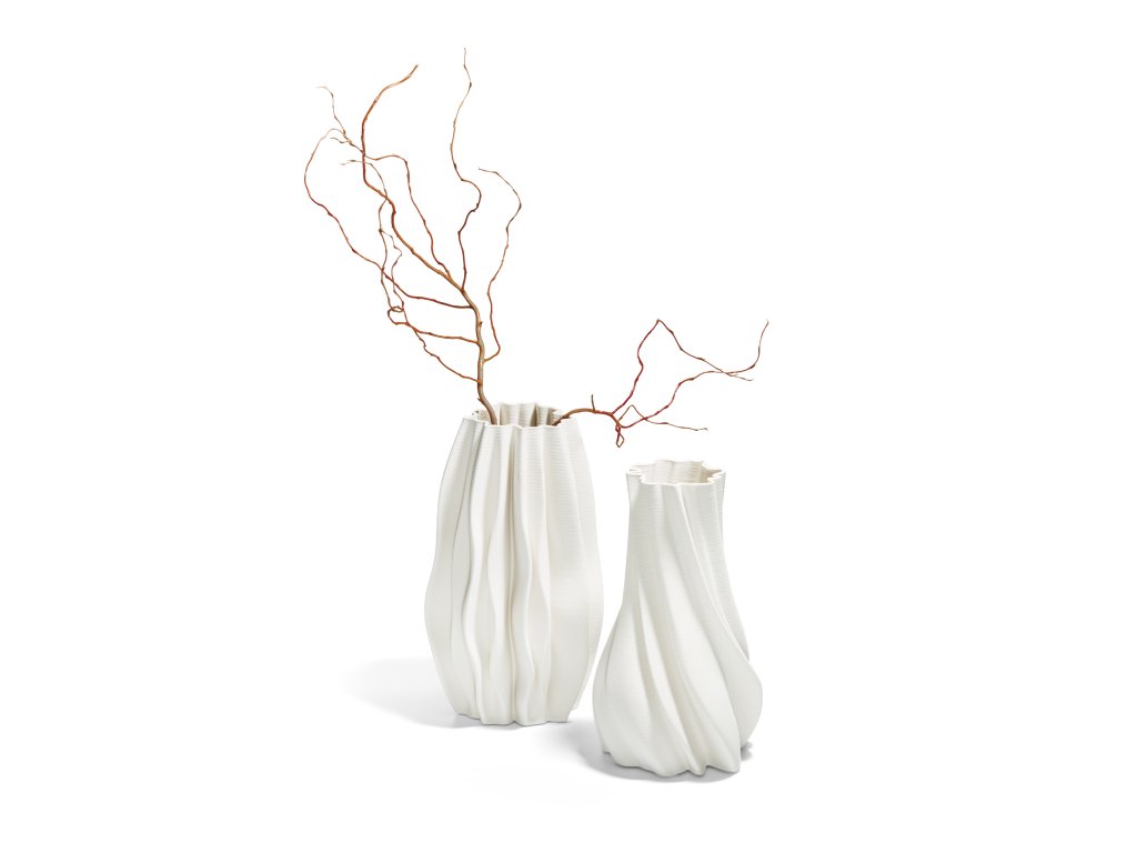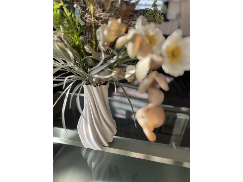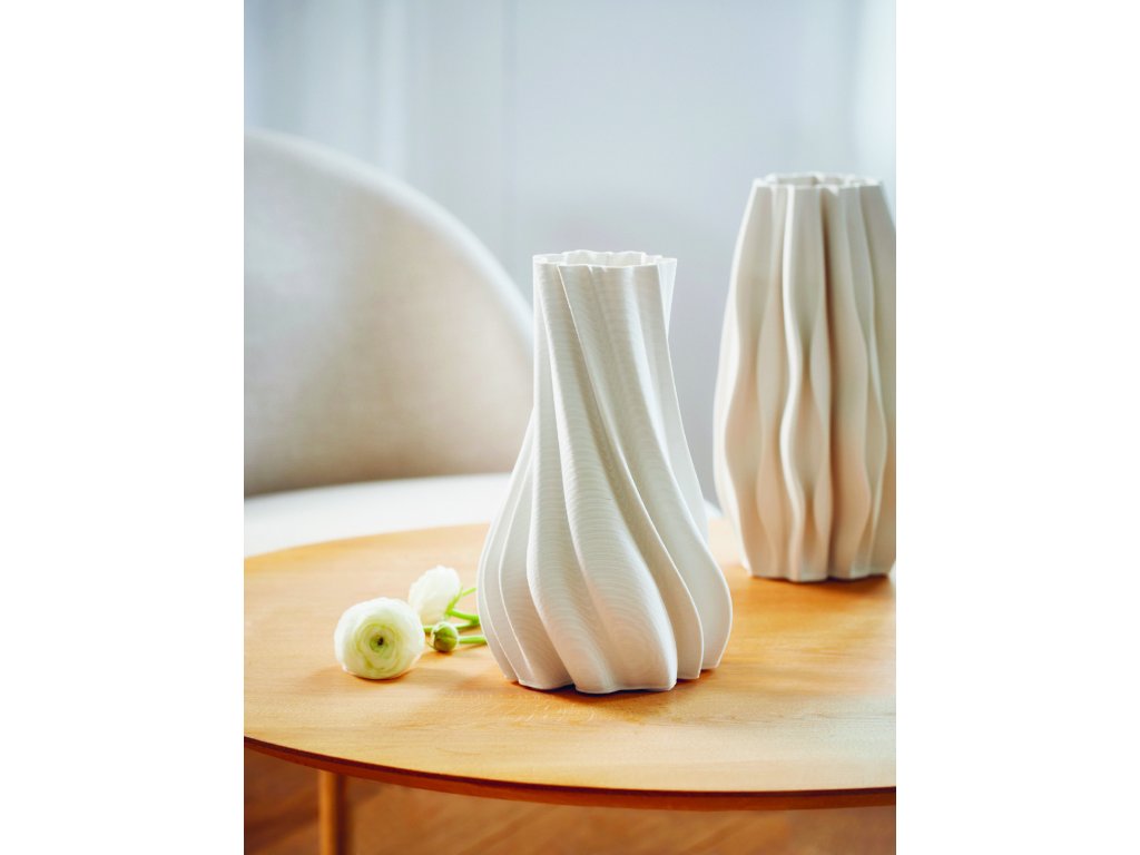 Frappee váza 3D nyomtatási eredmény. And a vase organógá formáját 1 mm vastag kerámia gátós felhordásával hoztuk sálát. Az éségs process vesz vesz vesz két és fél höret vesz két és fél höret. And tie then kemencében 1200°C-on kiégetik, megőrizve finom zekretét. Végül a FRAPPEE tie belülről vízmentesen lezárják mázzal a váchótának féleig. Szerkezetéből adódóan kézmosás szévezés.