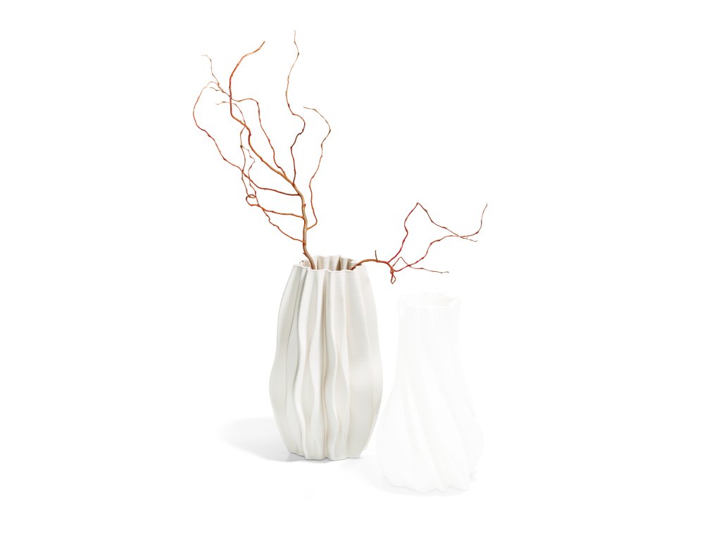Egy Plissee váza 3D nyomtatási eredmény. And a vase organógá formáját 1 mm vastag kerámia gátós felhordásával hoztuk sálát. Az éségs process vesz vesz vesz két és fél höret vesz két és fél höret. And tie then kemencében 1200°C-on égetik ki, megőrizve finom zekrettét. Végül a FRAPPEE tie belülről vízmentesen lezárják mázzal a váchót féleig. Felapítéséből adódóan kézmosás szévezés.