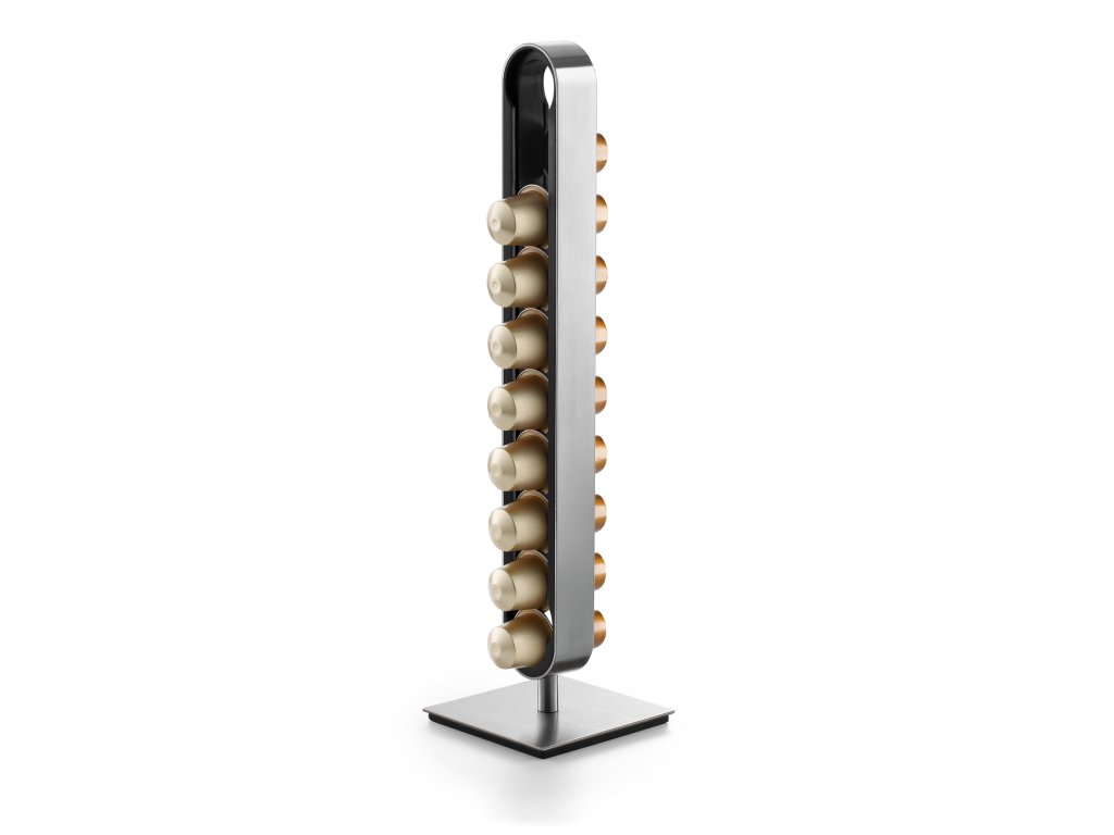 Tiszta dizájn, elegáns acél és precíz kivitelezés, amely emellett nagyon praktikus is, és akár az Ön kedvenc kávékapszuláit is tárolhatja. Egészen 18-at!