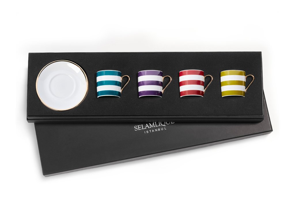 Ez a luxus ajándékkészlet négy aranyozott csíkos kávésbögrét és fehéraranyozott csészealjat tartalmaz. Minden bögrének megvan a saját egyedi színe - égei-kék, padlizsánlila, bíborvörös és dijoni sárga - melyik lesz a kedvenced? Bármelyiket is választod, élvezd a kávédat barátaiddal vagy családoddal ebben az egyedi készletben!
