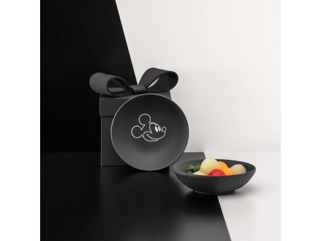 A matt porcelán jellegzetes, természetes pala ihlette struktúrájával feltűnő kontrasztot alkot a finom, minimalista Mickey motívummal. A fekete vagy fehér változat kiemeli a teljes kollekció grafikai tisztaságát, és modern, enyhén városias jelleget kölcsönöz neki.