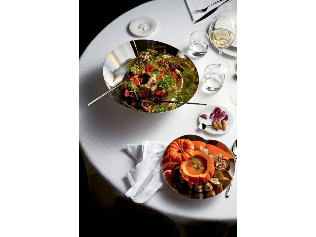 Egyedülálló saláta evőeszköz készletet tervezett a Moretti-Savoy tervezőpáros az olasz Alessi márka számára. A Moretti évek óta a konyhai dizájnos étkészletek és kiegészítők tervezésének szenteli magát. Munkái megtalálhatók a világ múzeumaiban. A Guy Savoy-jal való együttműködés azonban elindította a kiegészítők tervezésének korszakát, amelyek csak művészetnek mondhatók az asztalon. Az egyik ilyen darab a Human Collection salátatálaló evőeszközkészlete. A készlet egy klasszikus kanálból áll, amely kiválóan alkalmas egy leveles saláta kikanalazására, valamint egy faragott kanálból, amely finom kuszkusz salátákhoz és egyebekhez való. Az evőeszközök rozsdamentes acélból készültek, minimalista és időtlen stílusban tervezték. Az evőeszköz keskeny markolatrésze hihetetlenül elegáns elem, ugyanakkor könnyű kezelhetőséget biztosít. Az evőeszközök 29,8 cm hosszúak, és tökéletesen kiegészítik az azonos kollekcióból származó salátástálakat.