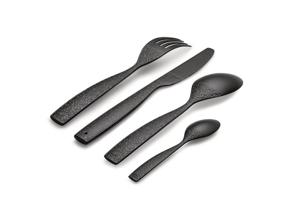 Marcel Wanders, világhírű tervező az olasz Alessi márka számára készített egyedi Dressed kollekciót testvére, a Dressed en plein air ihlette, amelyből ez az evőeszközkészlet is származik. A teljes sorozat stílusos termékekből áll, amelyek gazdagon, de ízlésesen és elegánsan díszítettek. Az evőeszközöket kültéri használatra tervezték. Piknikre, kertben vagy kirándulásra. Mindezek az alkalmak stílusosan és a környezetet tiszteletben tartva rendezhetők. Semmi okunk arra, hogy csúnya eldobható evőeszközöket vásároljunk, vagy klasszikus fém evőeszközöket vigyünk magunkkal, ami feleslegesen terheli a táskáját. Az Alessi evőeszközkészlet szintetikus melaminból készült, így az étkészlet könnyű és újrafelhasználható. Az evőeszközök színe fekete, aljuk gazdagon díszített. A készlet 16 darab evőeszközt tartalmaz: 4 evőkanál, 4 kés, 4 villa és 4 teáskanál. Reggelizze stílusosan a füvön.