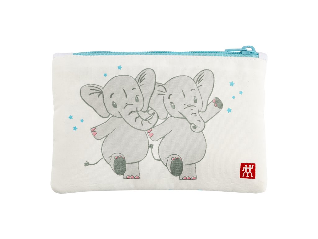 Gyermek manikűrkészlet elefánt motívummal ellátott puha tasakban. A készlet tartalmaz egy speciális ollót az érzékeny gyermekkörmökhöz, egy csipeszt hegygel és egy kefét a gyengéd körömtisztításhoz.