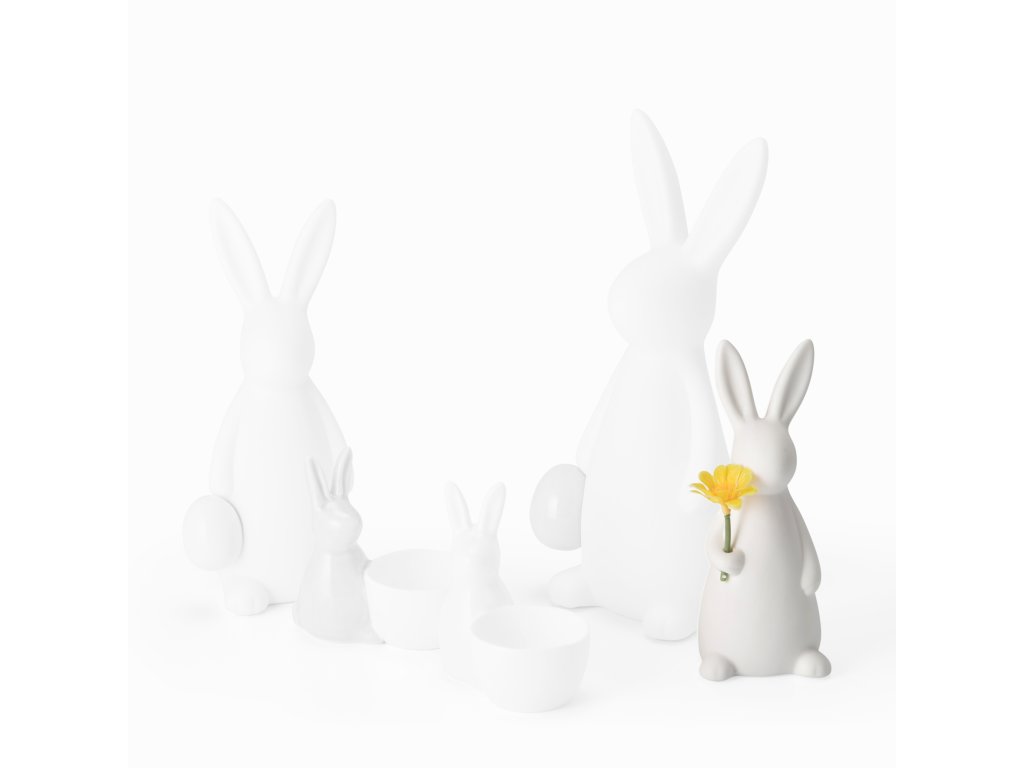 Ugyanebben a stílusban két kisebb, 8 cm-es nyuszit is kaphatsz tojástartóval, valamint nagyobb dísznyuszikat is három méretben - tojást vagy tavaszi virágot tartva. Minden figura kiváló minőségű fehér porcelánból készült, és elegánsan sima felülettel díszítettek - a nyuszikon nincs minta.