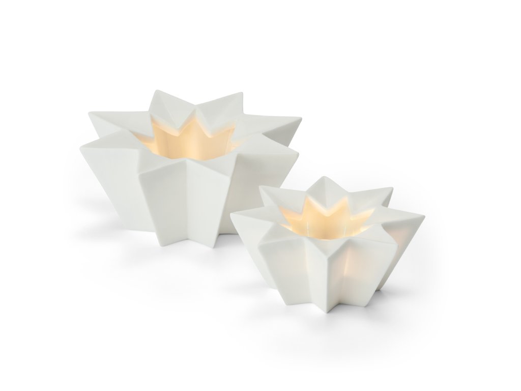 A finom fehér porcelánból készült Glory gyertyatartó csillag alakjával tűnik ki, amely egyszerre elegáns és ünnepi hatást kelt. Ha gyertyát helyezünk bele, az asztal vagy polc ragyogó központi díszévé alakul, békés és kényelmes légkört teremtve.