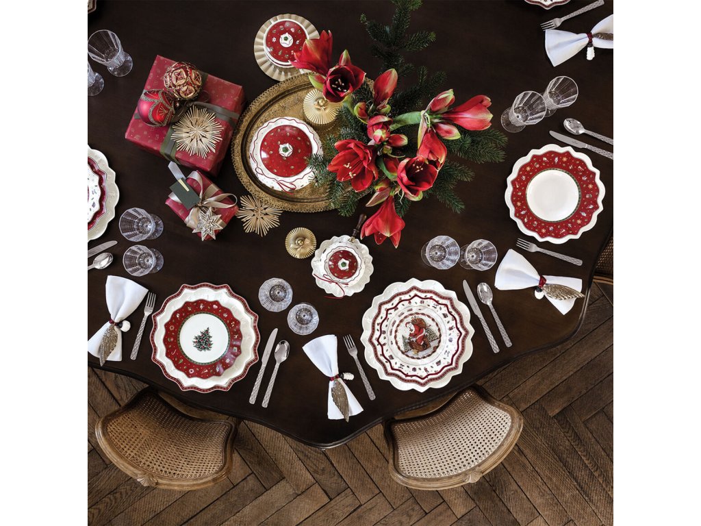 A német Villeroy & Boch cég Toy’s Delight kollekciója a karácsony kihagyhatatlan eleme. Megalkotóinak hála, a karácsony hangulata tükröződik a termékekből. Mi idézhetné fel jobban az ünnep légkörét, mint az apró fényekkel díszített karácsonyfa a körülötte szállingózó hópelyhekkel? Ezt és más díszítő elemeket is felfedezhet ezen a 70%-ban pamutból készült, két színváltozatban (piros/fehér és piros/zöld) megvásárolható terítőn, illetve a kenyérzsákon, mely a közös étkezéseknek ünnepi hangulatot kölcsönöz. A termékeknek köszönhetően a családi vacsorát egy varázslatosan díszített ünnepi asztalnál élvezheti.