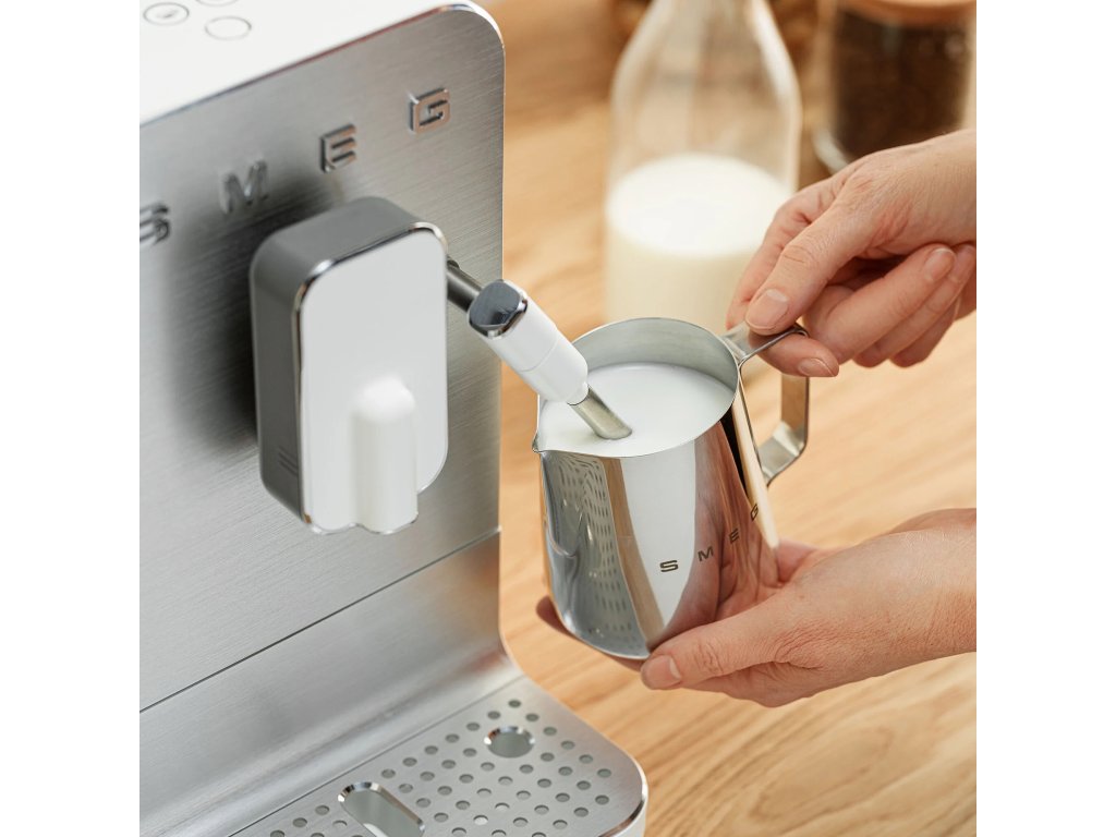 Kompakt, könnyű és könnyen tárolható Smeg BCC12 automata kávéfőző beépített tejhabosító fúvókával . Tartalmazza Rozsdamentes acél kúpos köves darálóval , az őrlés durvaságának/finomságának beállítási lehetőségével, 150 g kávébab befogadására alkalmas tartállyal. Kivehető 1,4 literes víztartály, 19 bar nyomás, vízmelegítő termoblokkal. 6 féle kávé elkészítése ristrettótól az espressón át az americanóig, tejhabosító cappuccinóhoz vagy flat white-hoz. Állítható cseppgyűjtő rács 9–18,5 cm magas bögrékhez.