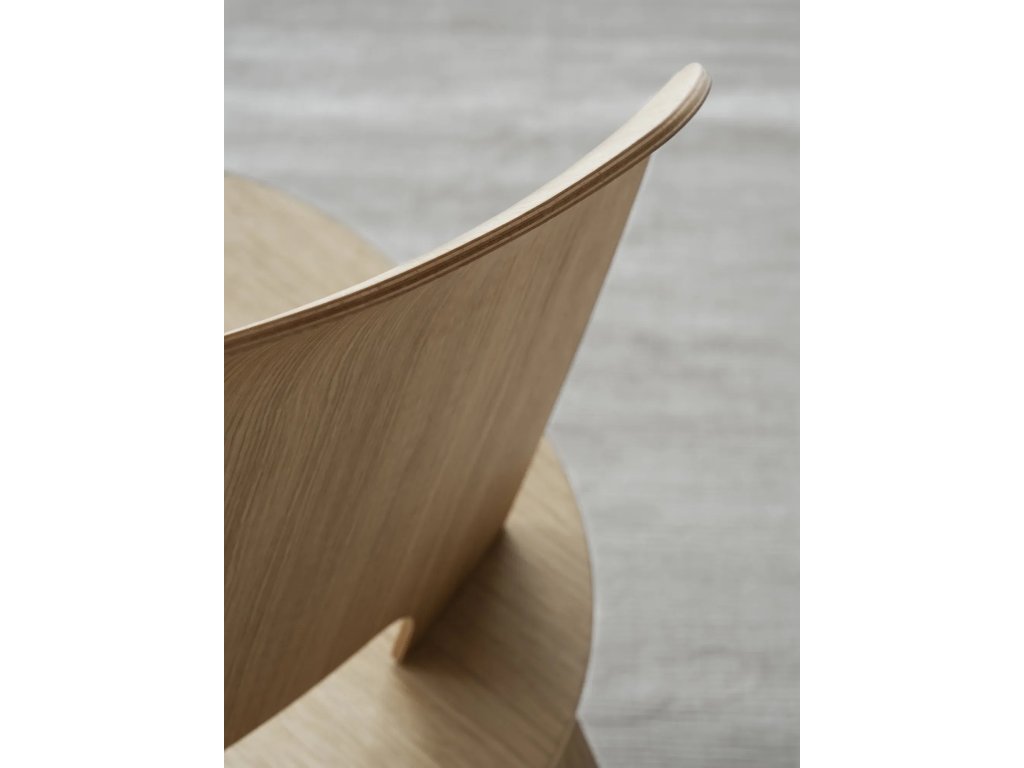 Anyag és fenntarthatóság: Négy ívelt, FSC minősítésű rétegelt lemezből készült, tölgyfa furnérral, ami organikus és meleg megjelenést kölcsönöz neki. Ráadásul a gyártás szinte karbonsemleges.Kényelem és elegancia: A lekerekített vonalak, a dönthető háttámla és a tágas ülőfelület nyugtató és kellemes környezetet teremtenek.