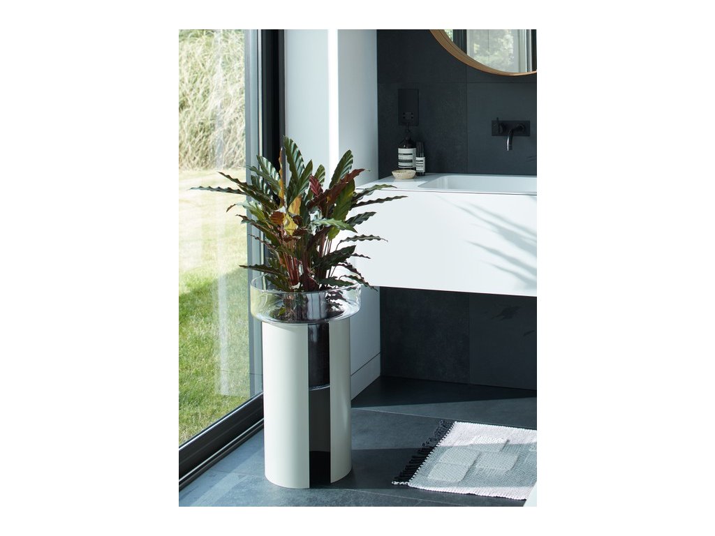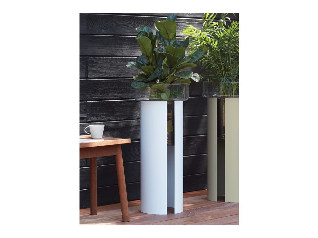 Két részből áll - egy kézzel fújt üvegtálból és egy porszórt acéloszlopból. A nyitott elülső rész elegendő fényt biztosít a gyökereknek, miközben könnyedséget és egyszerűséget ad az egész kialakításnak. Méretének köszönhetően tökéletesen kiemeli az összes szobanövény szépségét. Garantáltan modern és szép eleme lesz a belső térnek.