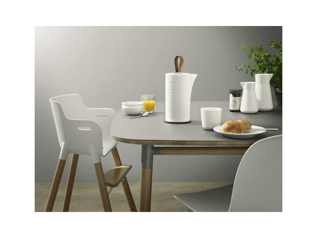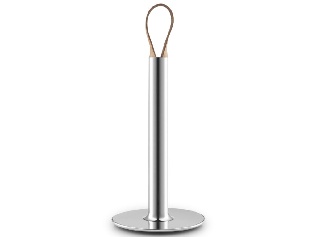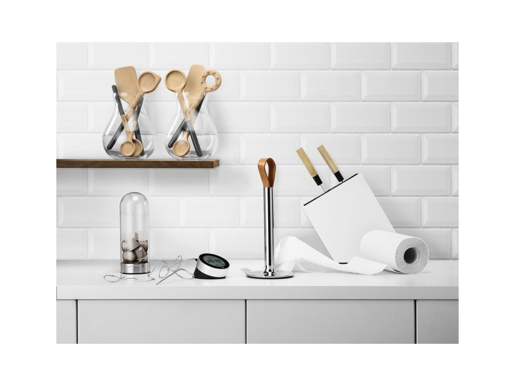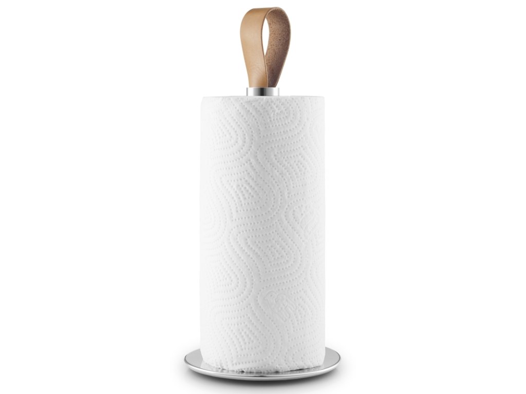 A konyhai papírtörlő tartó rozsdamentes acélból készült, elegáns bőrszíjjal,melynek köszönhetően könnyen átviheti egyik helységből a másikba. A többi Eva Solo termékhez hasonlóan ez a tervezési innováció is nagymértékben előmozdította ennek a hagyományos konyhai kelléknek a praktikusságát. A nehezebb talp tökéletes stabilitást biztosít annak érdekében, hogy könnyen le tudjon egy papírtörlőt szakítani. A gumírozott alj védi az étkezőasztalt vagy más felületeket a karcolásoktól. Anyag: rozsdamentes acél, gumi, bőr. Méretek: 320x130x130mm
