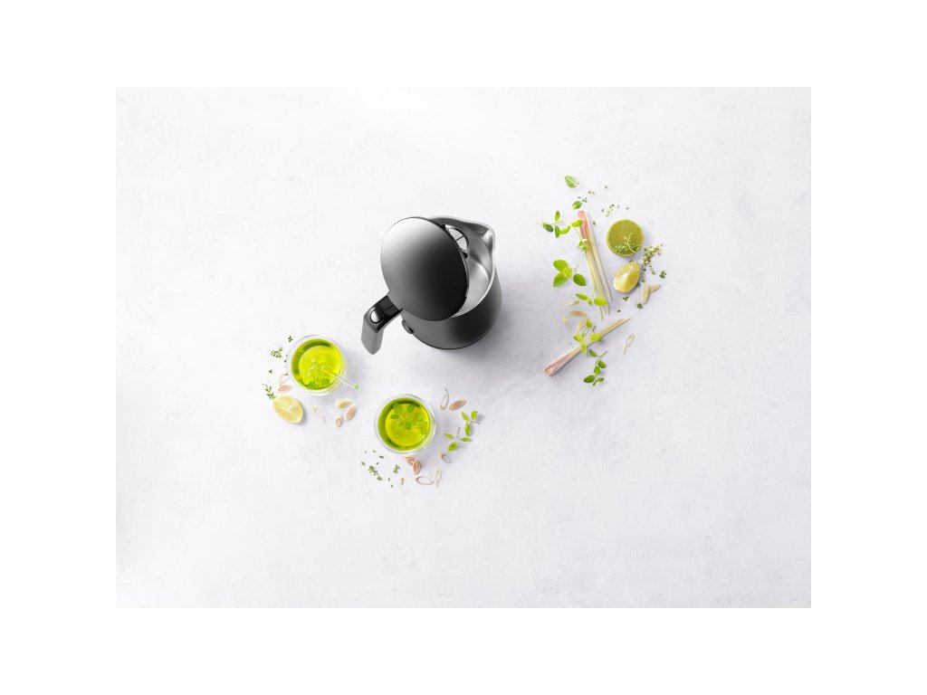 A modern fekete dizájnú Zwilling Enfinigy dizájner vízforraló duplafalú rozsdamentes acélból készült, 1,5 literes űrtartalommal. A monoblokkból készült vízforraló teste és a rejtett forrásban lévő spirál megkönnyíti a tisztítást. A biztonságos használatot többek között az is garantálja, hogy a vízforraló fedele csak 70°-ig nyitható , így a forró gőz nem égeti el a kezét.